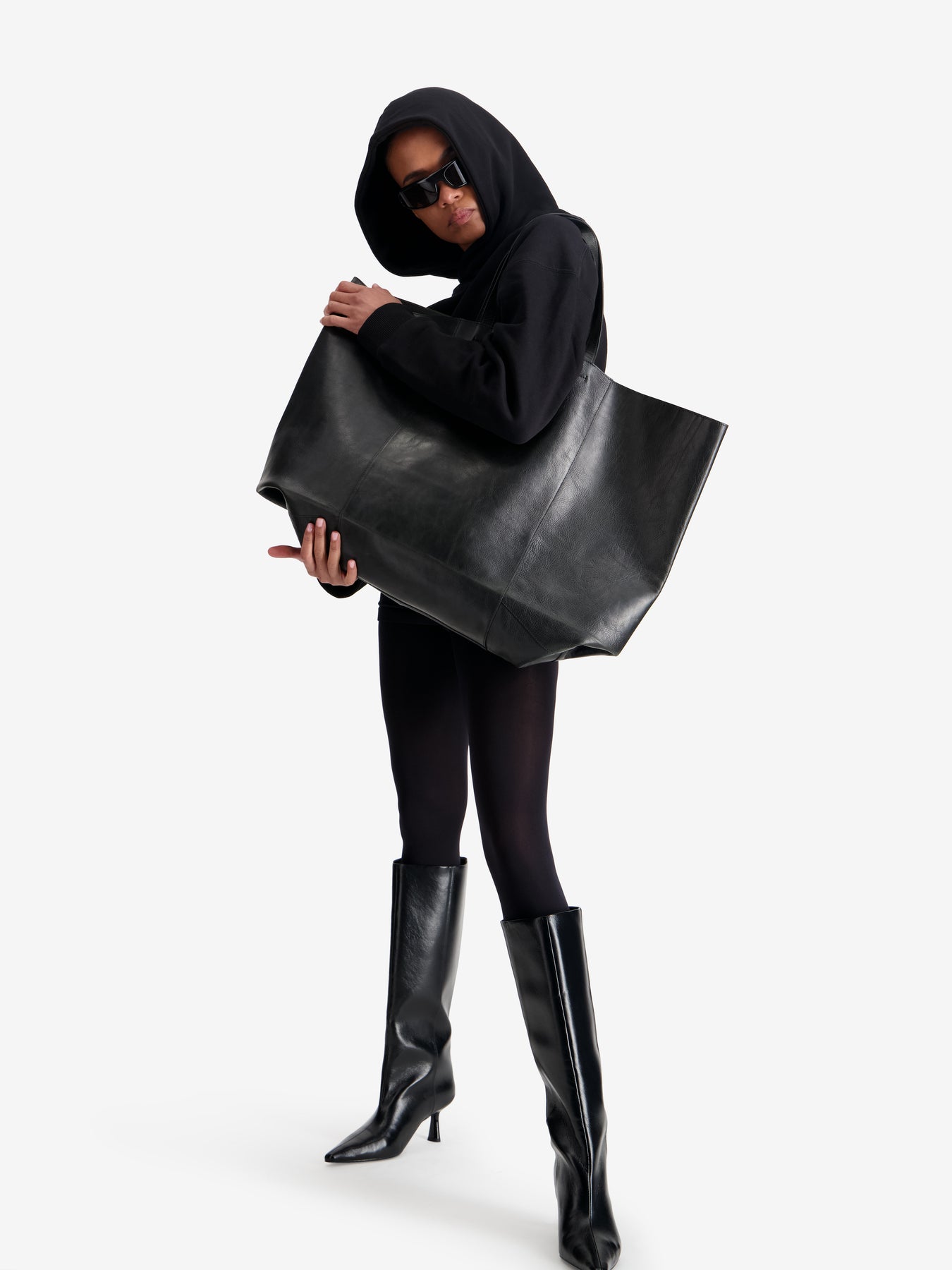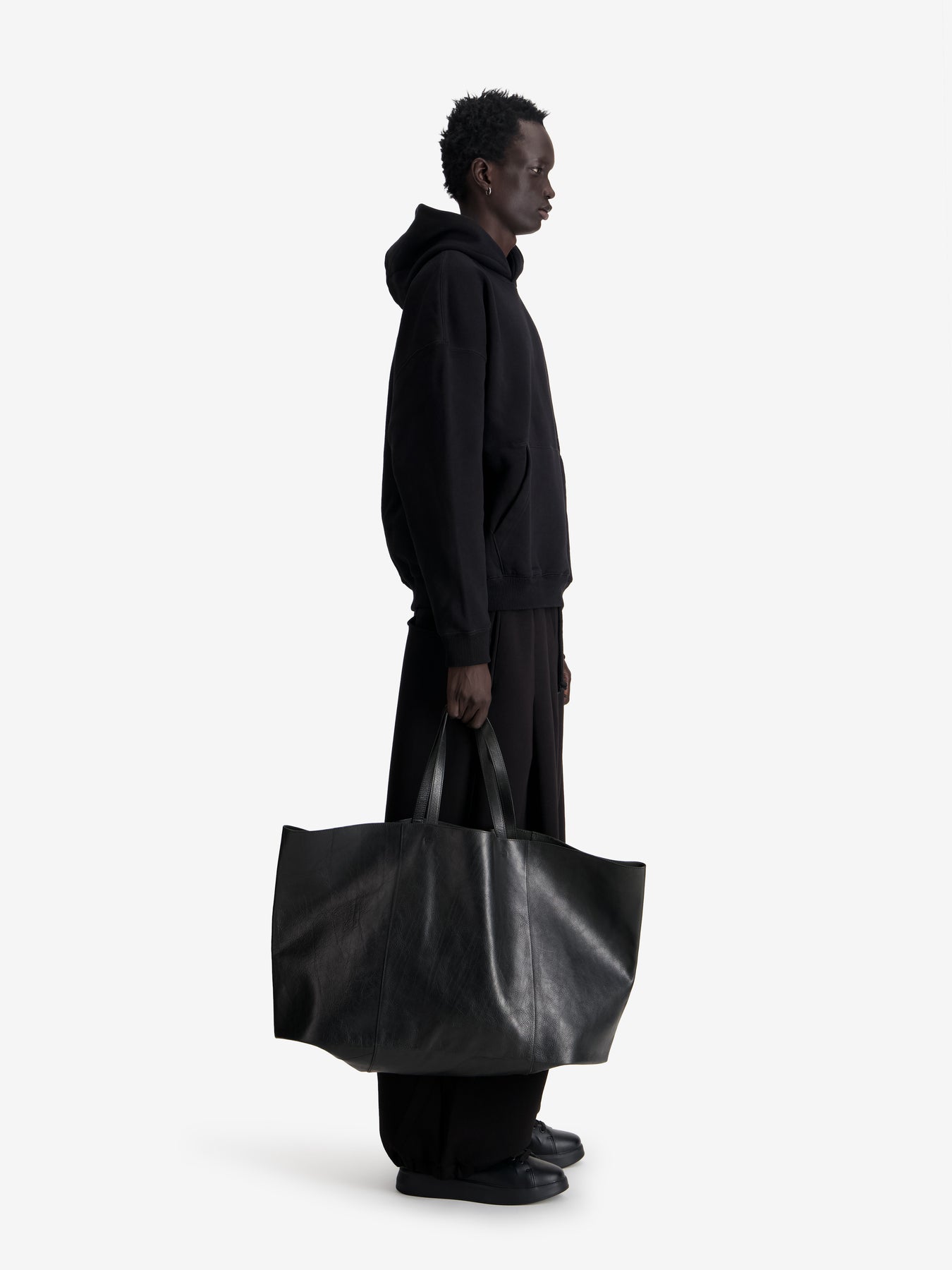 Talel’s tote bag is made from nappa leather accented with the brand’s embossed logo and triangle’s signature. Minimalist, it is capacious enough to use a laptop carrier.